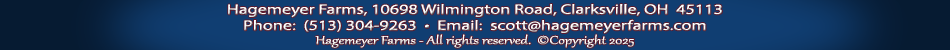 We are conveniently located minutes off Interstate 71, 35 miles North of Cincinnati and 70 miles South of Columbus. Hagemeyer Farms is less than 30 minutes from Warren County, Clinton County or Greene County Fairgrounds. We are also in close proximity to Miami Valley Gaming and Hollywood Gaming at Dayton Raceway.